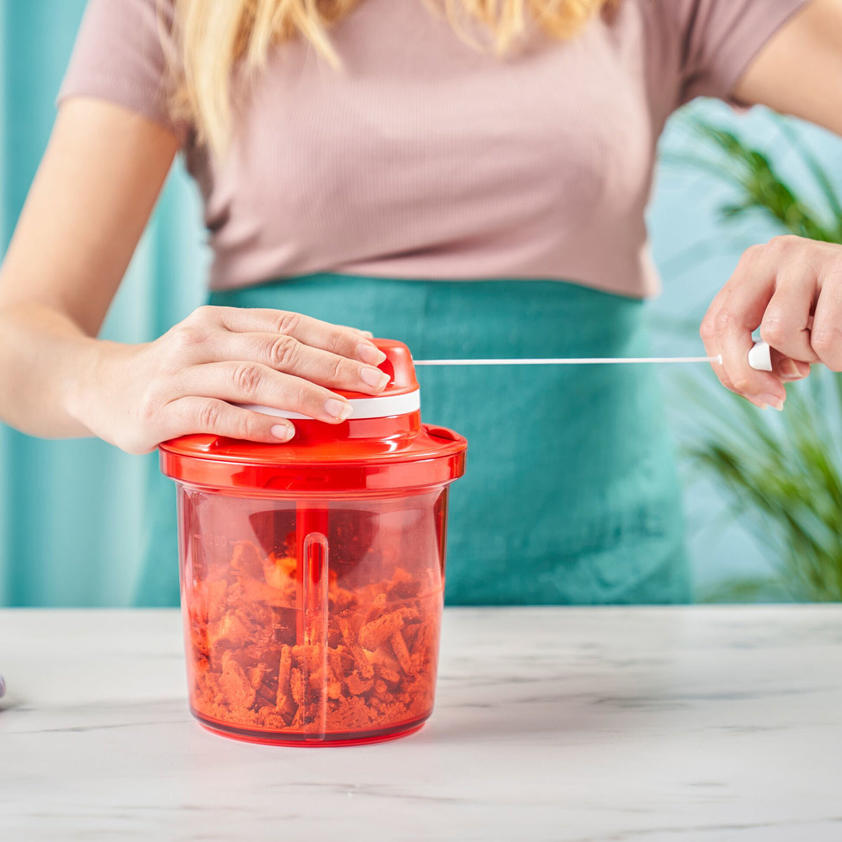 - Use it anywhere! No electricity needed for this manual food processor –one pull activates the blades.
