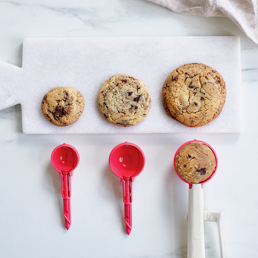 One handle and three different sized Scoops: Small 1 tbsp./15 mL, Medium 2 tbsp./30 mL and Large 3¾ tbsp./55 mL; perfect for portioning, shaping and measuring.